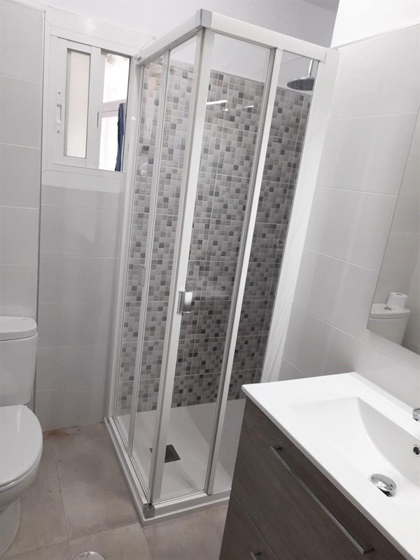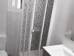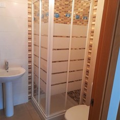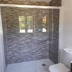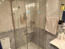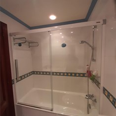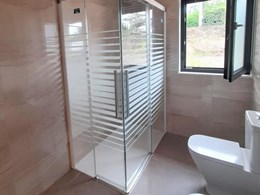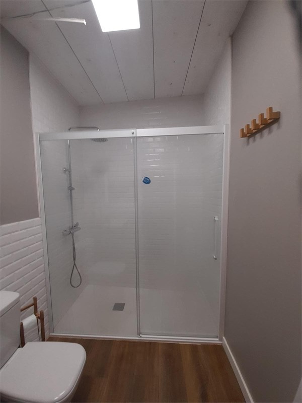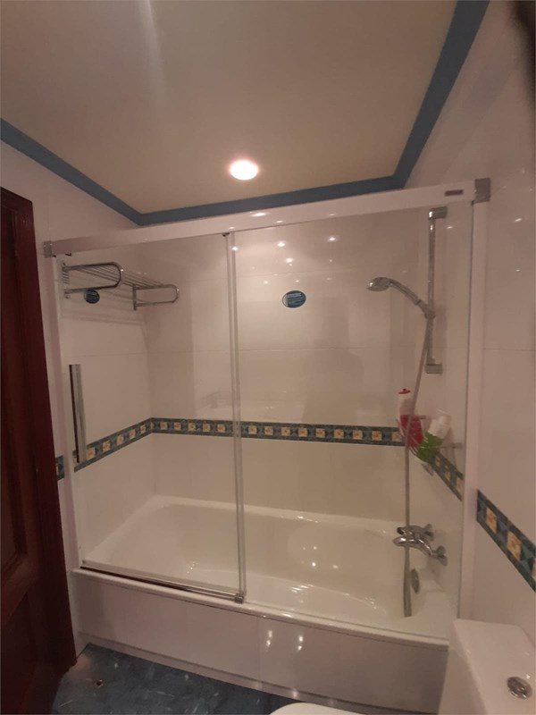Mampara frontal de perfil negro con dos hojas fijas y dos correderas